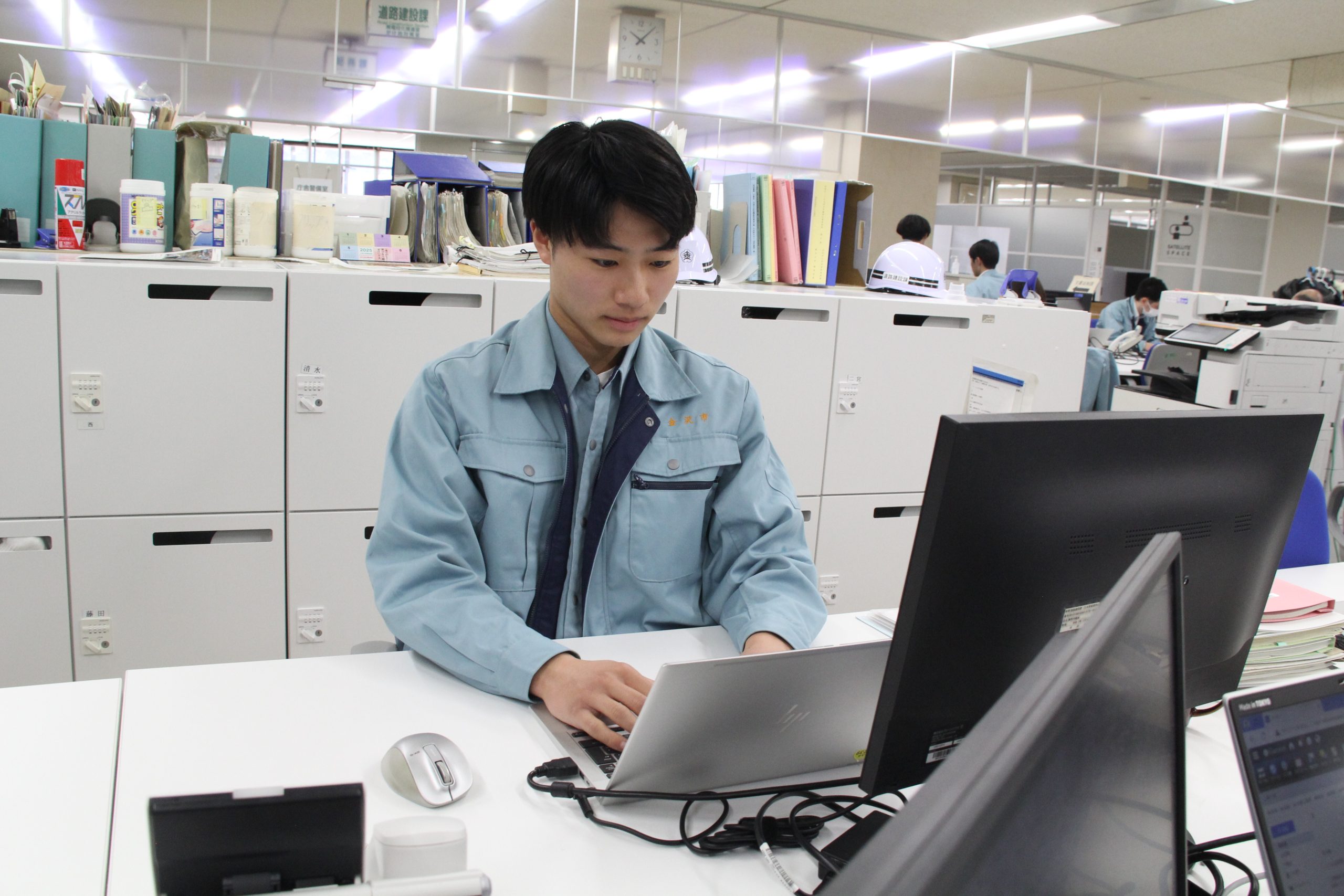 道路建設課は街路や道路の新設、無電柱化、がけ地の災害対策等を行っている部署となっています。現在、配属されている無電柱化推進室では、無電柱化業務に係る全体計画、設計、施工、管理の業務を行っています。事業を進めるにあたり、地元住民の方々のほか、電力、通信、上・下水道、ガス等の事業者との調整事項が多くあるため、連絡を密に取るように心がけています。また、長期間に及ぶ事業であることから、現在の計画に至った経緯をよく確認することを大切にしています。