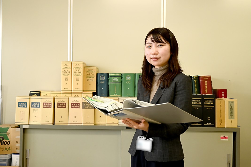 しかし、適正に管理・運営することにより、市の損失を防ぎ、市全体の利益につながる重要な仕事だと認識して取り組んでいます。市有財産に関わる問題が発生した際には先例を調べ、さらには法令に沿って対応し、スムーズな解決を目指します。総務課の業務は全ての部署に関わる横断的な業務も多く、他の課の職員から相談を受けることも少なくありません。それだけに、内部の調整で苦労することも多いのですが、目的が達成された時はうれしく、この仕事の醍醐味を感じます。