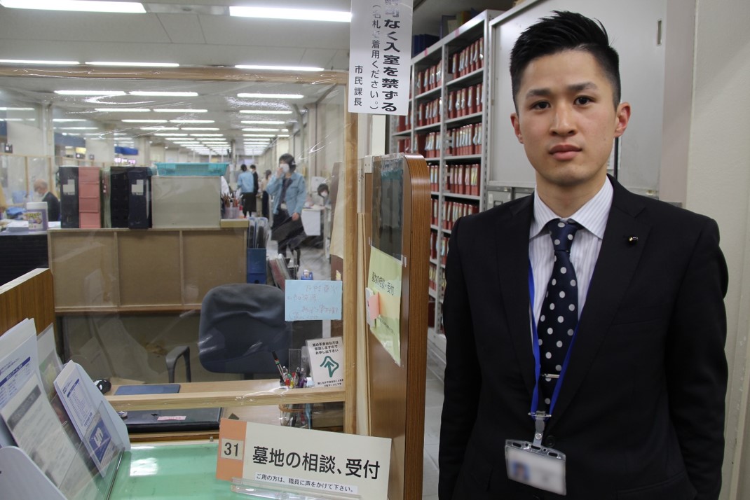 市民課生活衛生室で、墓地の相談や市営墓地の運営・管理、市営墓地・斎場の予算管理を担当しています。