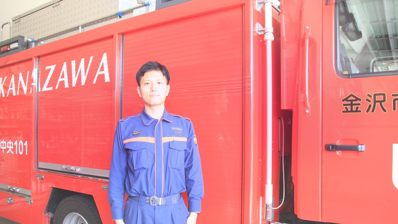 私は福井県出身です。消防士を目指して、専門学校に通っていた時、金沢市消防局に就職した先輩から、業務に関することや、職場環境についての話を聞く機会がありました。その内容に興味を持った私は、色々調べるうちに金沢市の歴史、伝統的な街並みの魅力に惹かれ、この街を守りたいと考えるようになり金沢市消防局を志望しました。